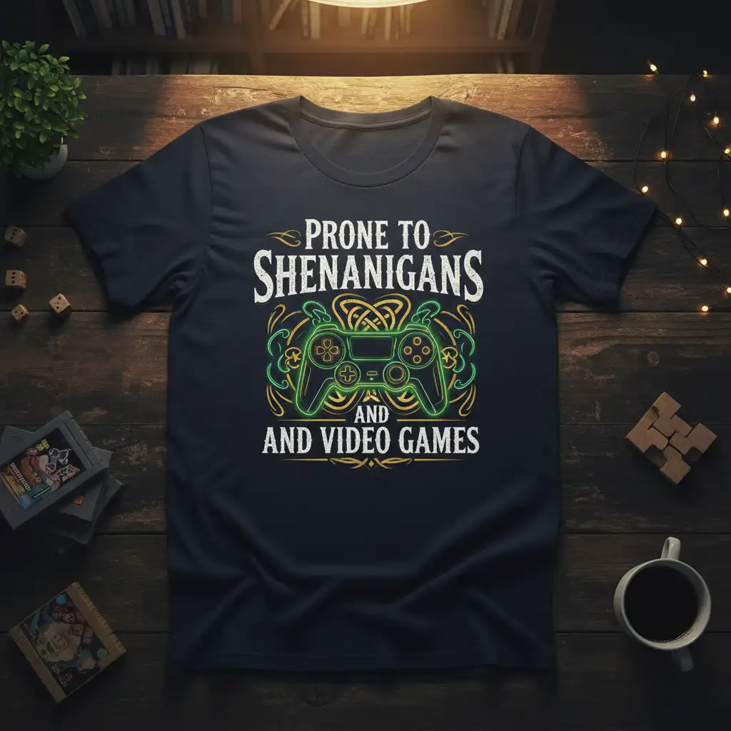 This t-shirt features the bold statement “Prone to Shenanigans and Video Games,” celebrating the dual passions that many gamers share. The design is brought to life with a striking neon green video game controller graphic, intricately detailed and visually captivating. Surrounding the controller are elegant Celtic knot patterns, adding a touch of mystique and depth to the overall aesthetic. This combination creates a unique look that stands out and appeals to anyone who lives and breathes video games.