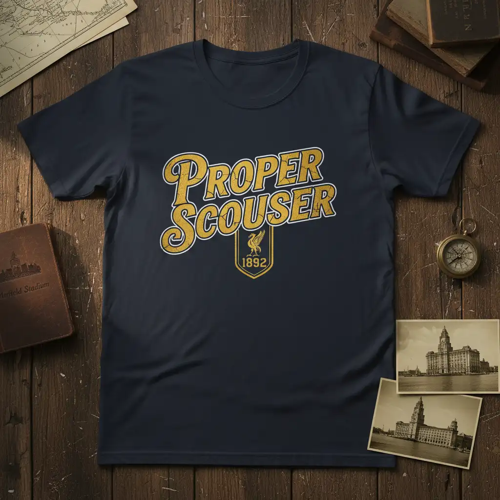 This t-shirt is crafted for individuals who carry the essence of being a “Proper Scouser.” The bold “Proper Scouser” text, rendered in a distinctive vintage font, immediately signifies a deep connection to Liverpool’s distinct dialect and character. It’s a nod to the authenticity and resilience that defines the city’s people. The inclusion of the “1892” alongside the iconic Liver Bird crest anchors the design in history, celebrating the enduring spirit and footballing legacy that resonates through generations.