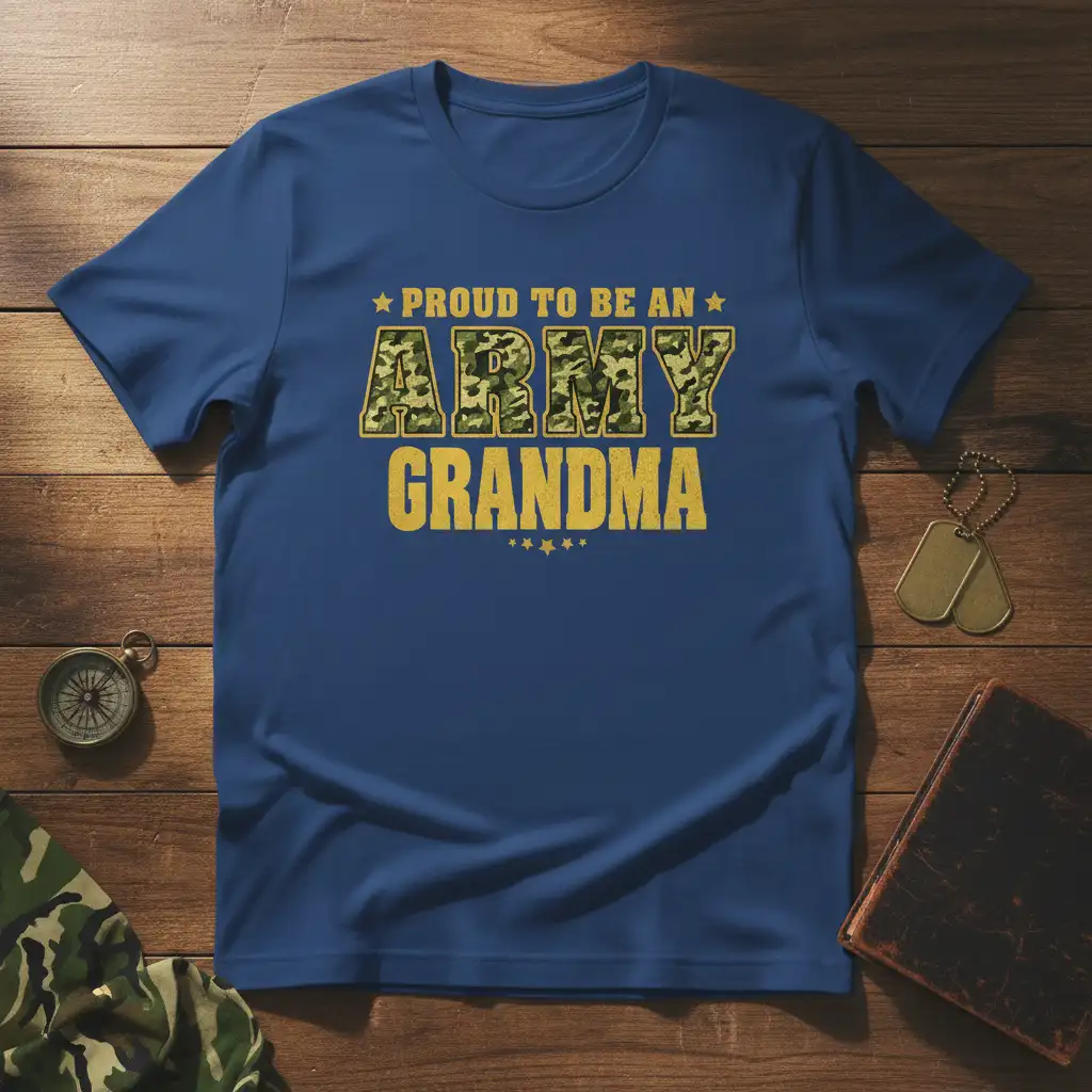 Pick from Black, Navy, Royal, Dark Heather, Red, and White to match your mood and wardrobe staples. Each colorway keeps the Proud to be an Army Grandma design clear and photo-ready for everyday wear.