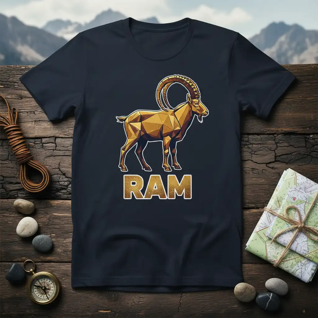 This design features a beautifully rendered geometric ram, also known as an ibex, showcasing its impressive horns and powerful stance. The polygonal style gives the animal a modern, artistic flair while still conveying its natural grandeur. Beneath the graphic, the word “RAM” is presented in a bold, textured font that perfectly complements the overall aesthetic. This t-shirt is a tribute to the wild, embodying the spirit of exploration and the awe-inspiring presence of mountain wildlife.