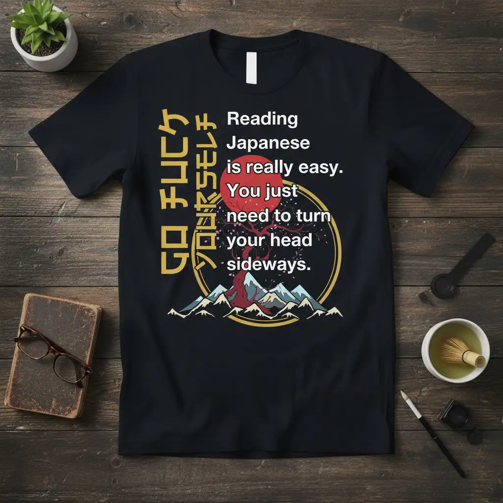 This design playfully highlights the visual complexity of the Japanese writing system. It’s a clever nod to the unique challenge of reading Japanese, where a simple rotation can change perspective entirely. The phrase resonates deeply with anyone who has embarked on the rewarding journey of mastering Japanese, offering a moment of shared understanding and lightheartedness.