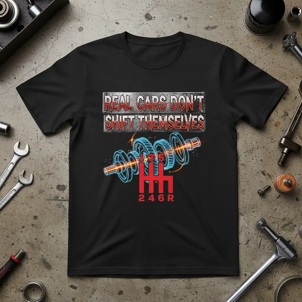 This REAL CARS DON’T SHIFT THEMSELVES T-Shirt is made for real life — soft enough to wear all day and durable enough to keep its shape and color wash after wash. Whether you’re out running errands or relaxing at home, it fits right into the moment.
