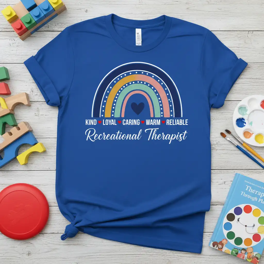 This t-shirt beautifully encapsulates the core values that define a great Recreational Therapist. The design features the words KIND, LOYAL, CARING, WARM, and RELIABLE, each thoughtfully placed within a cheerful rainbow motif. These attributes are fundamental to providing effective and compassionate care. They reflect the empathy and strength required to create engaging and therapeutic activities for diverse populations.