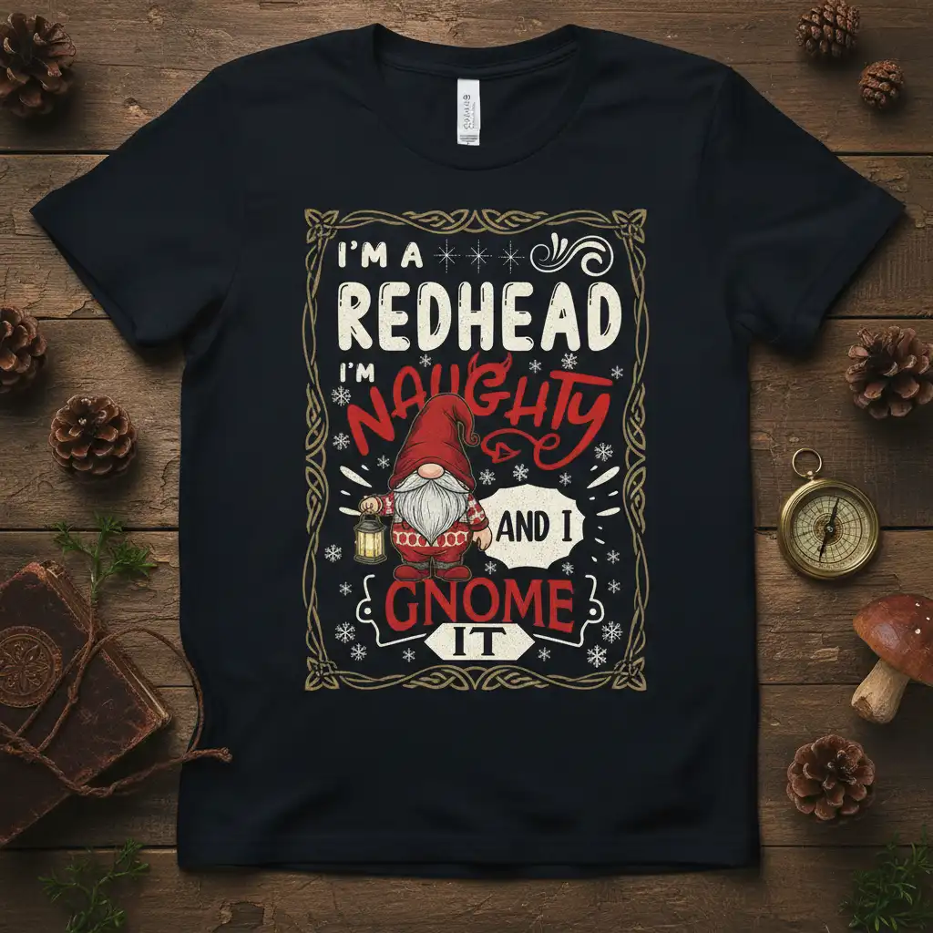 This t-shirt is more than just apparel; it’s a statement piece that celebrates the unique identity of redheads. The phrase “I’m a Redhead I’m Naughty And I Gnome It” captures a sense of playful rebellion and festive cheer. It’s designed to resonate with those who embrace their fiery locks and their spirited nature. The artwork is detailed and engaging, ensuring that the design stands out and sparks conversation.