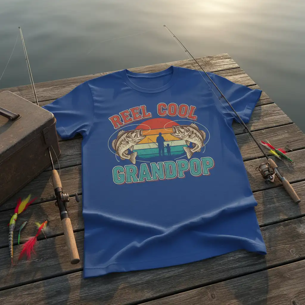 The “Reel Cool Grandpop” design features a captivating blend of retro aesthetics and fishing imagery. Two dynamic bass fish flank a silhouette of a grandfather and child fishing against a vibrant sunset, evoking nostalgic memories and the joy of shared experiences. The typography is bold and classic, ensuring the message stands out beautifully.