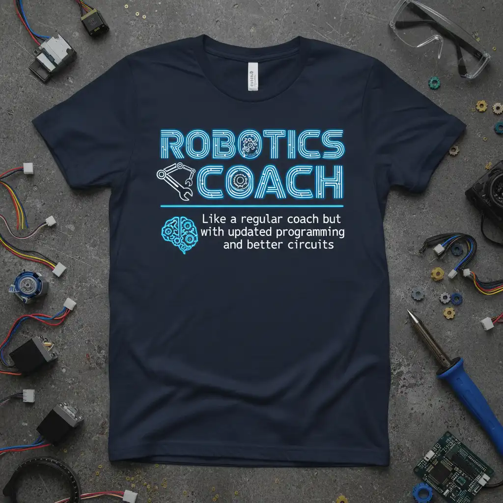 ROBOTICS COACH Like a regular coach but with updated programming and better circuits T-Shirt is more than just apparel; it’s a statement piece for the brilliant minds shaping the future of technology. This unique design celebrates the dedication and advanced knowledge of robotics coaches, acknowledging that their expertise extends beyond conventional coaching methods. It’s crafted for comfort and durability, making it an ideal gift for educators, mentors, and enthusiasts who live and breathe robotics. The witty inscription is sure to resonate with anyone who understands the intricate world of programming and circuit design.