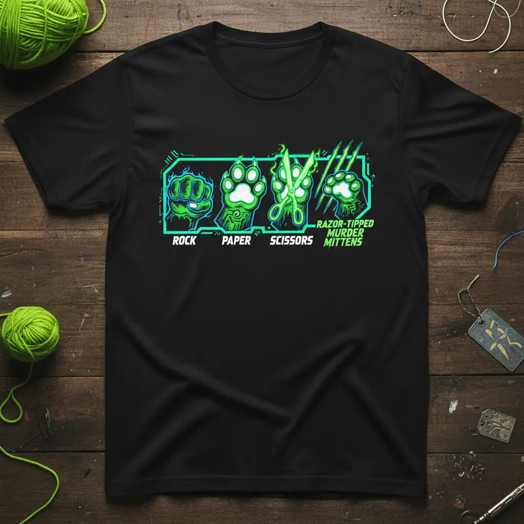 This ROCK PAPER SCISSORS RAZOR-TIPPED MURDER MITTENS design humorously reimagines the classic game of Rock Paper Scissors, replacing traditional elements with a cat-centric theme. It features a green fist for Rock, a paw print for Paper, scissors, and finally, the infamous “Murder Mittens” represented by a clawed paw. The neon green accents against the black fabric create a striking visual that stands out.
