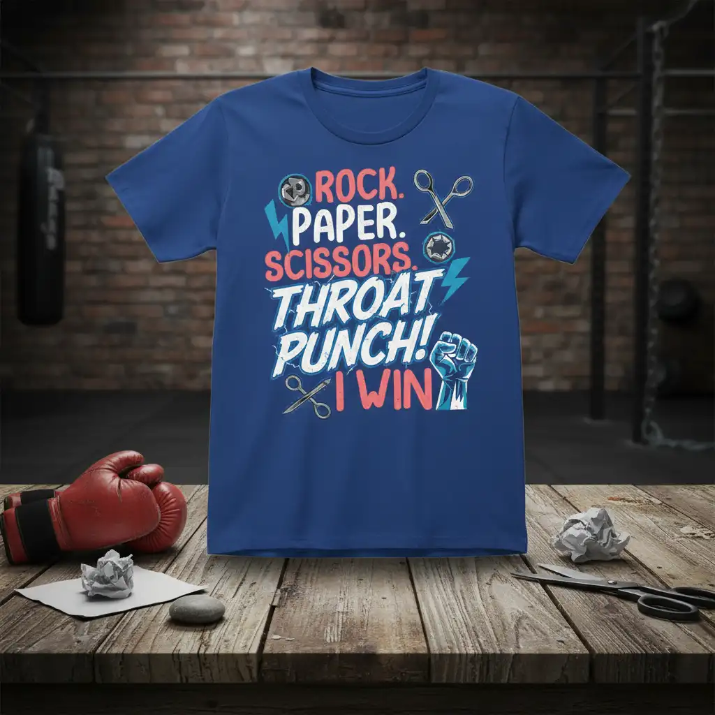 ROCK. PAPER. SCISSORS. THROAT PUNCH! I WIN t-shirt is the ultimate declaration of a fierce competitive spirit, delivered with a side of hilarious audacity. This design captures the essence of playful rivalry and the sheer joy of triumph in a way that’s sure to turn heads and spark laughter. It’s perfect for anyone who believes in winning, no matter the cost, and isn’t afraid to show it. The bold typography and dynamic graphics create a visually striking statement piece. This shirt is more than just apparel; it’s a conversation starter and a testament to a bold personality.