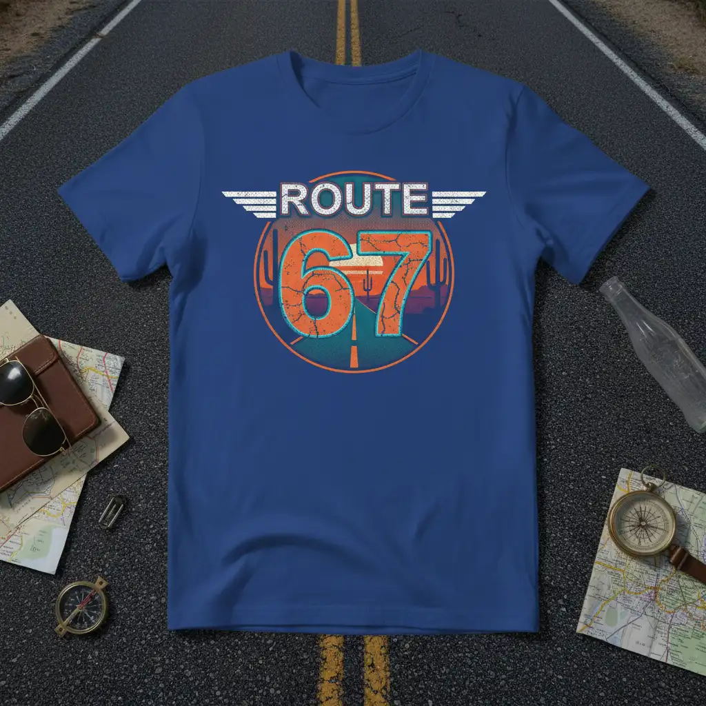 The bold typography for “ROUTE” and “67” is instantly recognizable, reminiscent of classic signage found along America’s most storied byways. It’s a piece that tells a story of exploration, discovery, and the sheer joy of the journey itself. Wear it proudly on your next adventure or as a daily reminder of your passion for the open road.