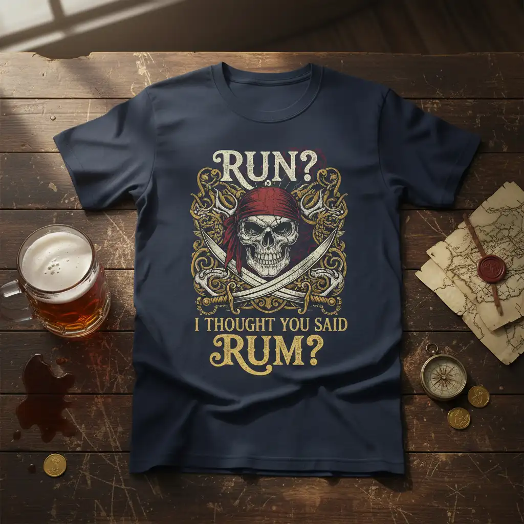 The witty text, “RUN? I THOUGHT YOU SAID RUM?”, plays on a common homophone, creating a humorous and memorable statement. This clever wordplay is sure to get a chuckle from fellow enthusiasts of spirits and pirate lore alike. The typography is carefully chosen to complement the overall aesthetic, ensuring the message is both clear and stylish, making it a standout piece for any wardrobe.