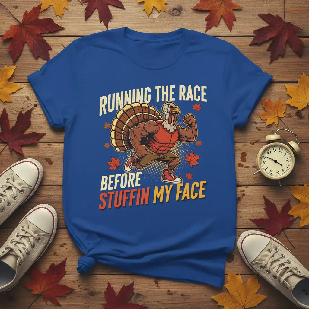Running the Race Before Stuffin My Face, this uniquely humorous t-shirt captures the perfect sentiment for the Thanksgiving season. It’s designed for those who appreciate a good laugh and a bit of pre-feast activity. The vibrant graphic features a buff turkey, ready to hit the track before indulging in a delicious holiday meal. This tee is more than just apparel; it’s a statement piece that embodies the spirit of fun and festivity associated with Thanksgiving traditions.
