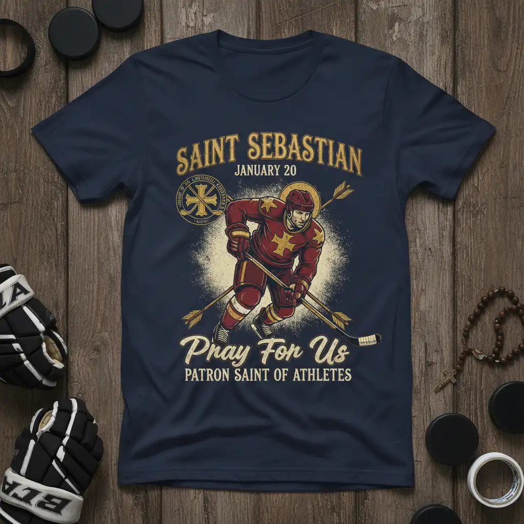 Saint Sebastian January 20 Pray For Us Patron Saint of Athletes t-shirt is designed for individuals who draw strength from their faith and passion for sports. This unique apparel honors Saint Sebastian, revered as the patron saint of athletes, combining spiritual devotion with athletic spirit. The design features a striking visual of Saint Sebastian in action as a hockey player, adorned with arrows symbolizing his martyrdom, and surrounded by inspiring text. It serves as a constant reminder of perseverance, faith, and the blessings bestowed upon those who strive for greatness in their chosen fields.