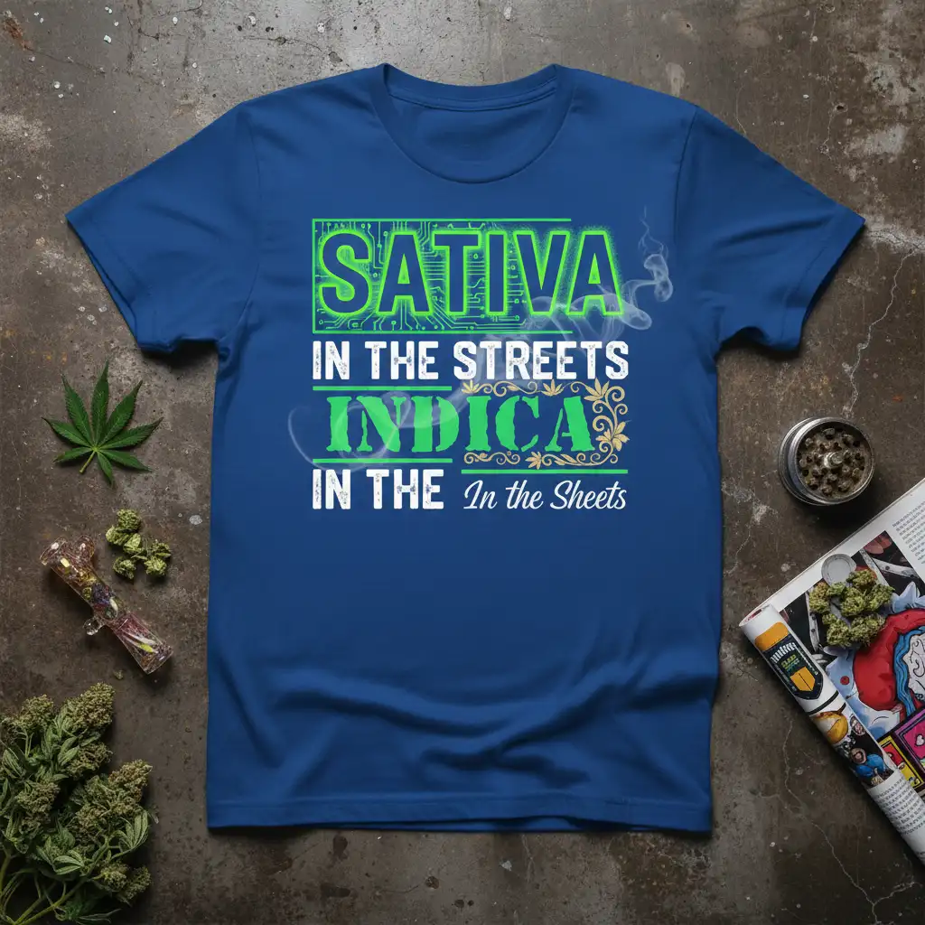 Sativa in the Streets Indica in the Sheets T-Shirt: A Celebration of Cannabis Duality