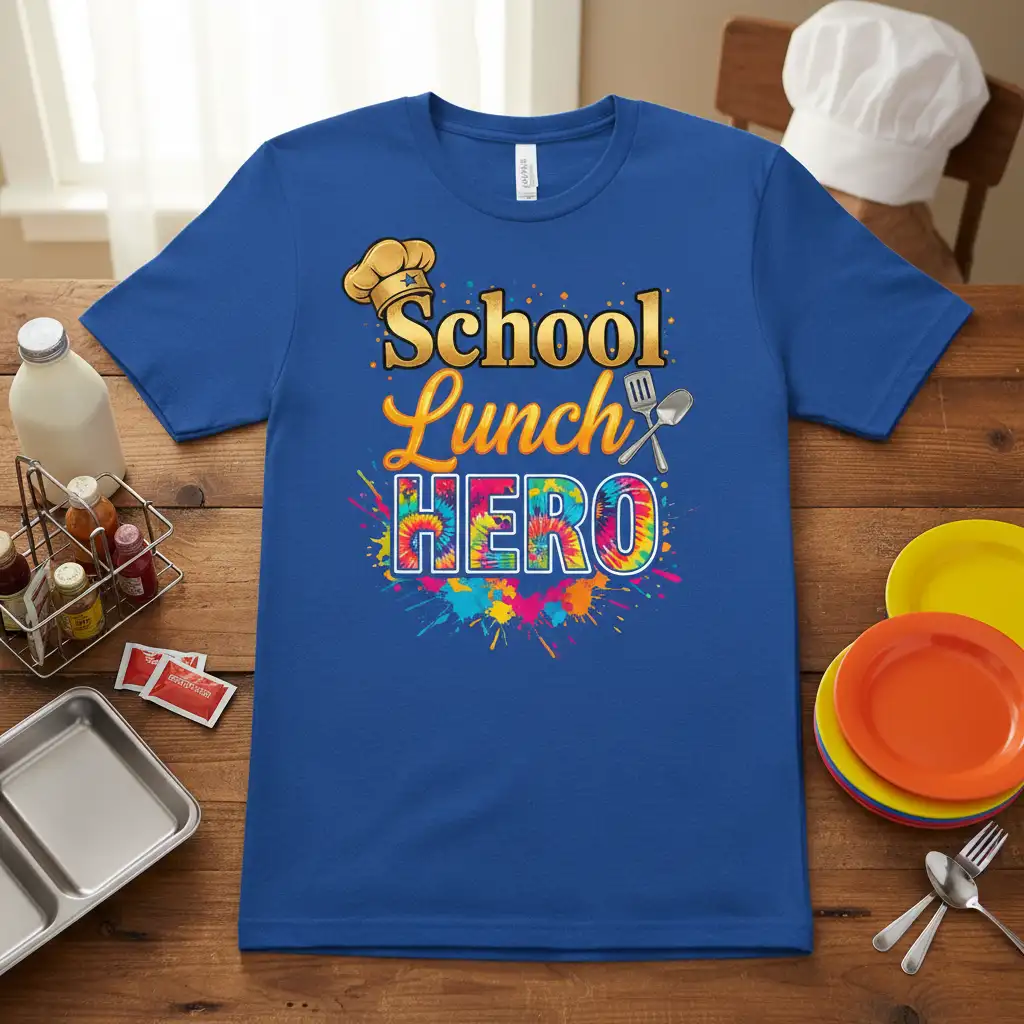 The “School Lunch HERO” graphic bursts with life, featuring a golden “School” and “Lunch” above a stunning tie-dye “HERO.” Complementing this are energetic splatters of blue, pink, yellow, and green paint, creating a look that’s both fun and festive. This visual appeal ensures that the wearer stands out and feels celebrated, embodying the spirit of their important role in the school environment. It’s a design meant to bring joy and recognition.