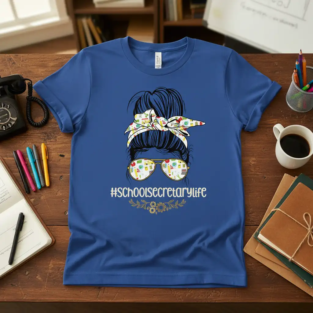 This unique tee features a dynamic graphic that embodies the spirit of a school secretary. A stylish messy bun hairstyle is paired with cool aviator sunglasses, cleverly filled with an assortment of essential school supplies. From colorful pencils and markers to miniature bottles, each element represents the busy and organized world of school administration. The prominent #schoolsecretarylife hashtag serves as a bold declaration of pride and belonging.