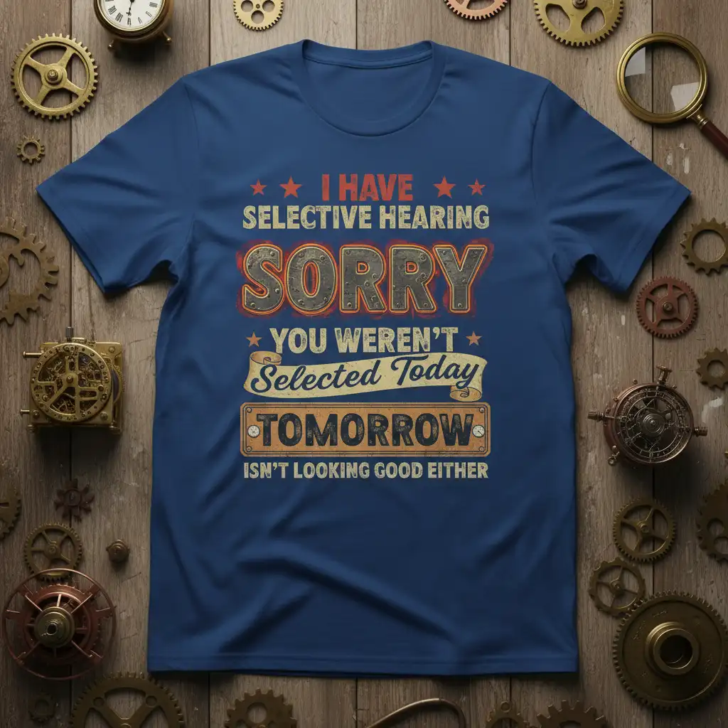 This “I HAVE SELECTIVE HEARING SORRY YOU WEREN’T Selected Today TOMORROW ISN’T LOOKING GOOD EITHER” t-shirt is the ultimate expression of auditory preferences with a humorous flair. Its bold typography and engaging design make it a standout piece in any casual outfit. It’s a fun way to communicate your listening habits without uttering a single sound, relying on the shirt’s powerful message.
