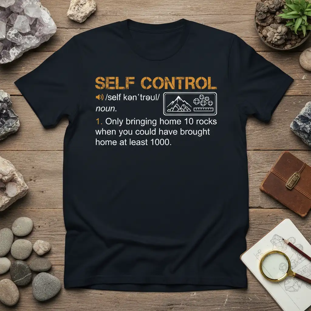 SELF CONTROL noun. 1. Only bringing home 10 rocks when you could have brought home at least 1000. This statement t-shirt is designed for those who truly understand the discipline required to limit their rock collection. It humorously defines self-control from the perspective of a passionate collector, acknowledging the immense temptation to acquire more specimens than is strictly advisable. The design features a clear, dictionary-style layout with a playful twist, making it a unique conversation starter for anyone with a love for geology, minerals, or simply a strong hobby. It’s the perfect way to express your dedication to your craft with a touch of wit.