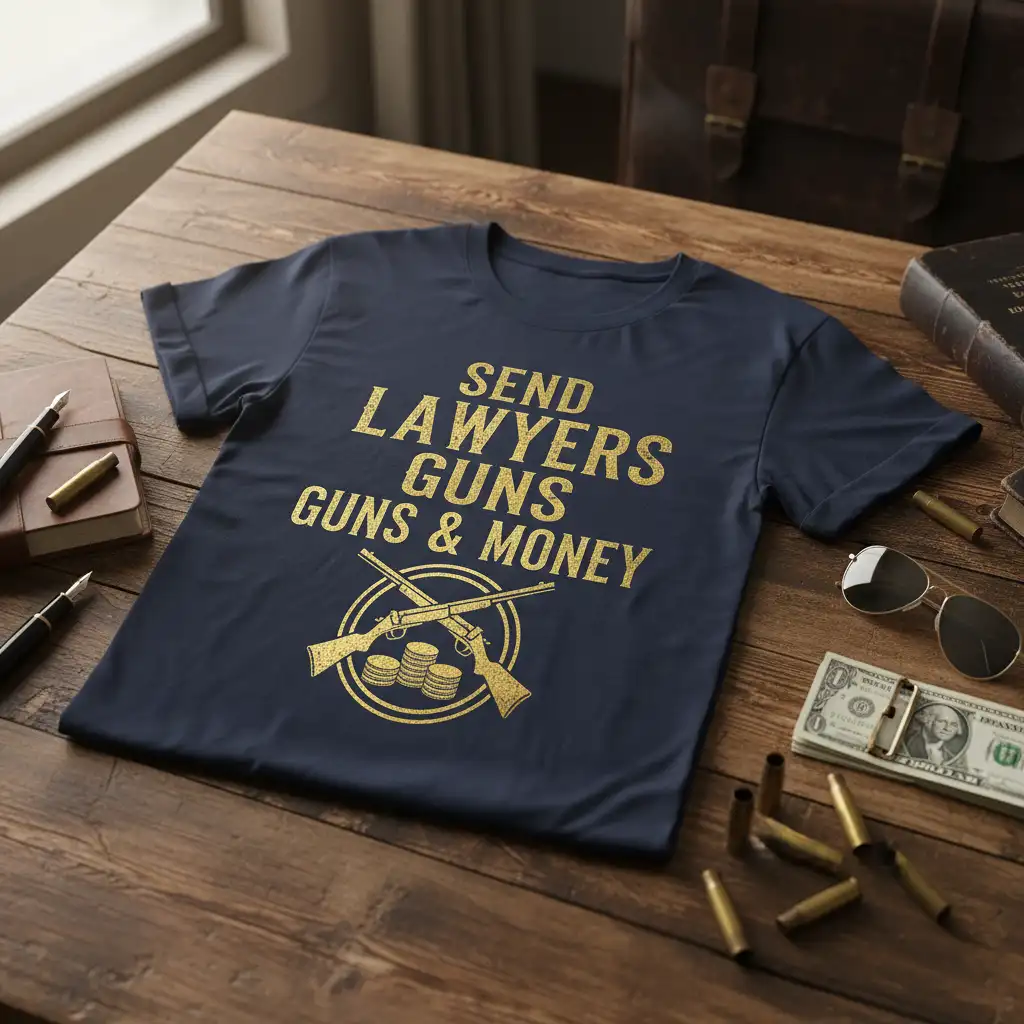 SEND LAWYERS GUNS GUNS & MONEY emblazoned on this t-shirt makes a bold and humorous statement, perfect for anyone with a sharp wit and a connection to the legal profession. This design captures a popular sentiment with its striking gold typography and iconic graphic. It’s more than just apparel; it’s a conversation starter and a way to express a unique perspective. The high-quality print ensures the message stands out vibrantly against the dark fabric, making it a standout piece in any casual wardrobe.