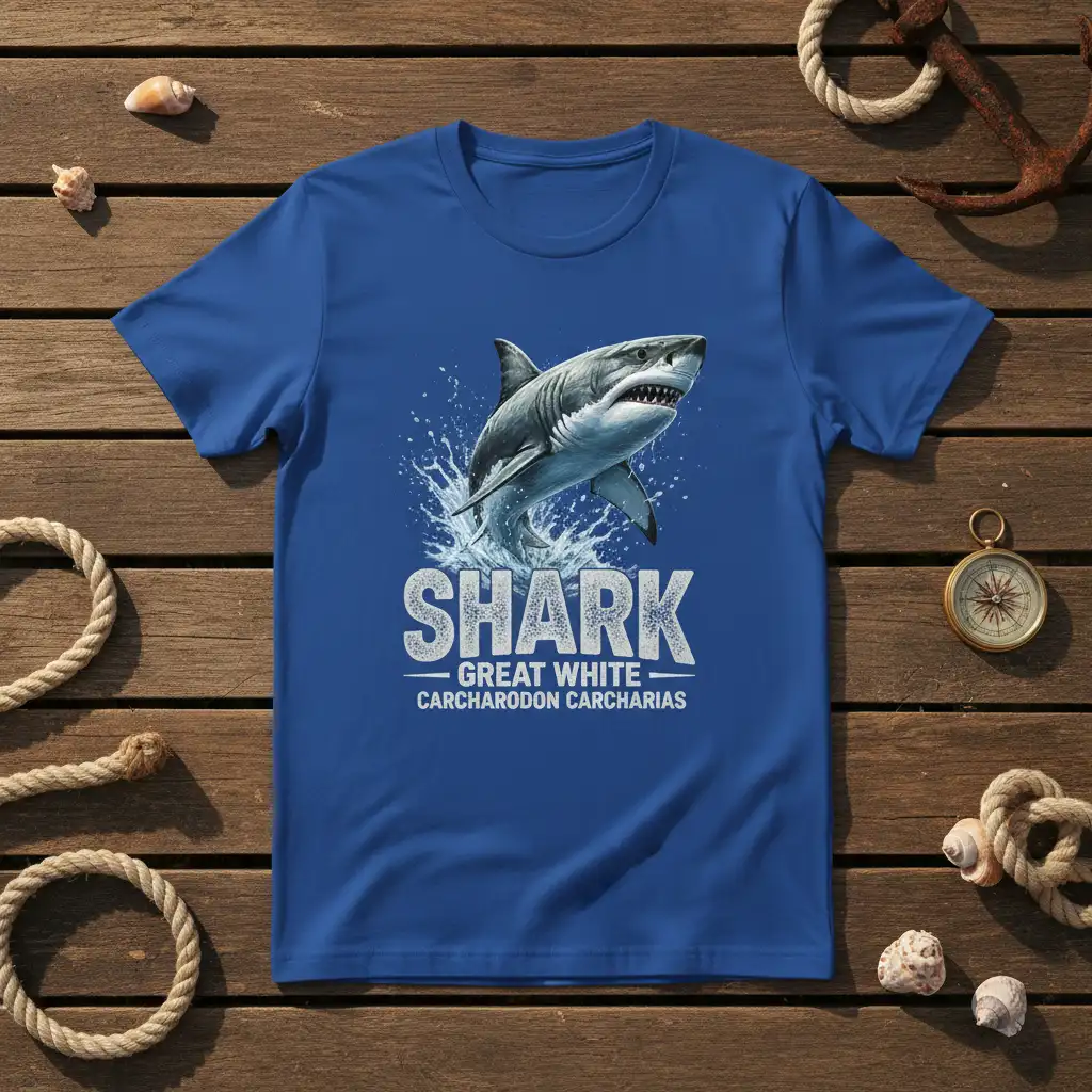 The great white shark, or Carcharodon carcharias, represents power, resilience, and the untamed spirit of the ocean. This t-shirt design embodies those qualities, offering a way to connect with the marine world. It serves as a reminder of the importance of ocean ecosystems and the magnificent creatures that inhabit them. Wearing this tee is a declaration of your interest in marine life and a way to support awareness for these often-misunderstood animals.