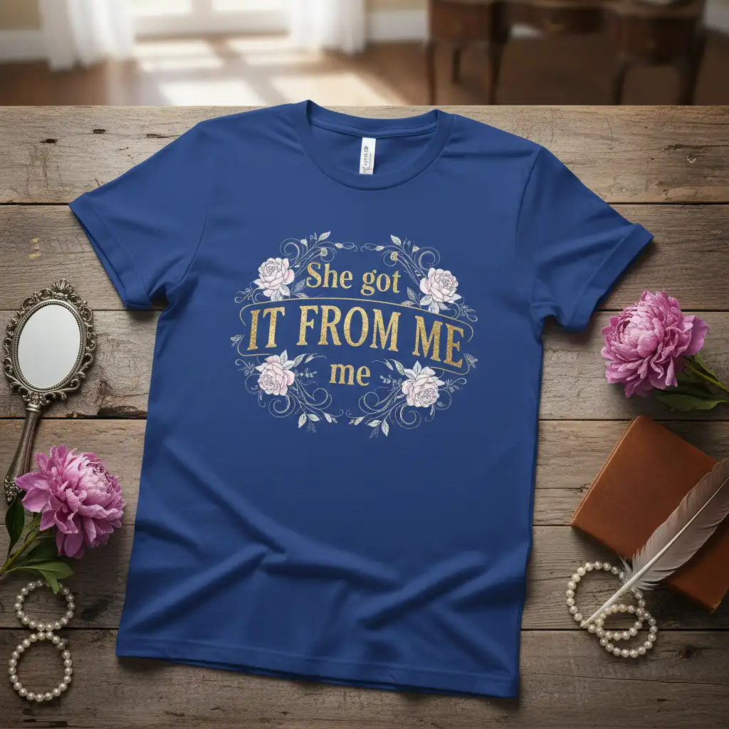 This t-shirt proudly displays the phrase “She Got IT FROM ME me,” capturing a common sentiment among proud mothers. The elegant floral design adds a touch of sophistication, making it suitable for various occasions. It’s a conversation starter and a beautiful reminder of the influence and legacy passed down through generations.