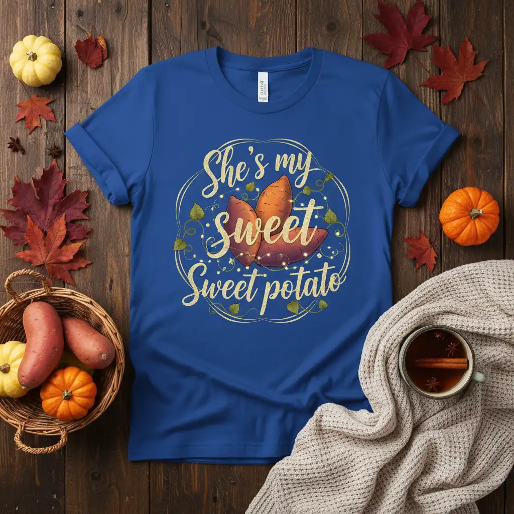 The phrase “She’s my Sweet Sweet potato” resonates deeply, offering a unique and heartwarming way to express devotion. Whether you’re celebrating an anniversary, Valentine’s Day, or simply want to show your partner some love, this t-shirt is a thoughtful choice. The design incorporates subtle autumn elements, making it especially fitting for fall celebrations and Thanksgiving gatherings.