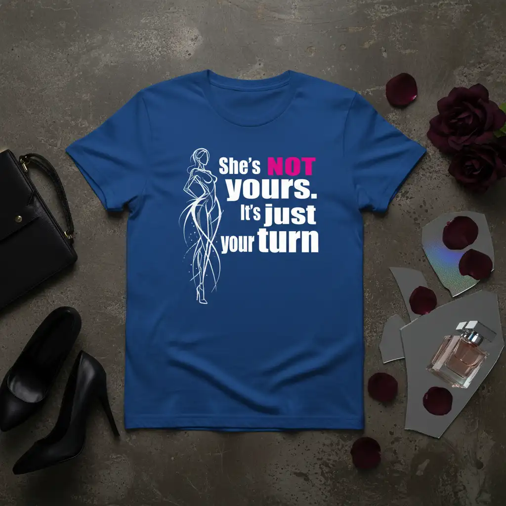 This eye-catching t-shirt proudly displays the phrase “She’s NOT yours. It’s just your turn,” making it an instant conversation starter. The typography is bold and clear, designed to capture attention and convey its message with impact. Accompanying the text is a sleek, artistic illustration of a woman, adding a touch of elegance and sophistication to the design. This combination creates a visually appealing piece that is both modern and empowering, perfect for anyone who wants to express their independent spirit through their fashion choices.