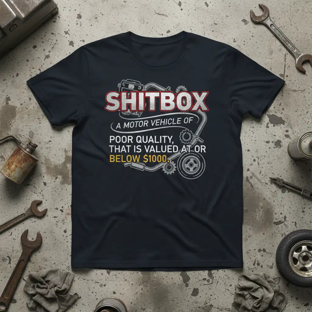 SHITBOX A MOTOR VEHICLE OF POOR QUALITY, THAT IS VALUED AT OR BELOW $1000. This statement t-shirt is for the true automotive enthusiast who understands the value of a ride that’s more about character than cost. It’s a badge of honor for those who can appreciate a well-loved, albeit imperfect, set of wheels. The design captures the essence of owning a vehicle that might not be a showstopper, but it gets the job done and has stories to tell.