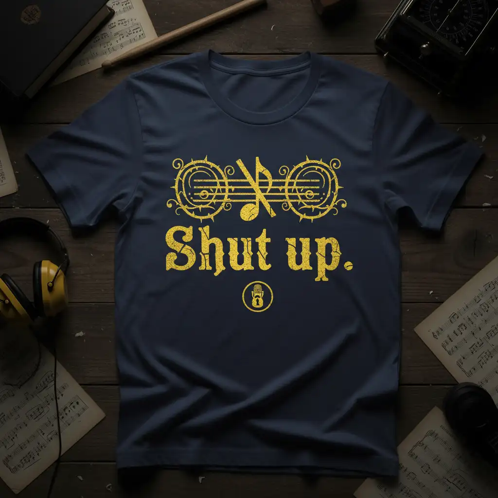 The striking design features the direct command “Shut up.” in a distressed, attention-grabbing font. Above the text, an intricate gold graphic combines musical notes and staffs with a stylized microphone icon, hinting at the world of audio production, podcasting, and vocal performance. This combination creates a visually appealing piece that speaks directly to creators and enthusiasts in the audio space. It’s a subtle nod to the power of words and the importance of making your voice heard, ironically delivered through a message of silence.