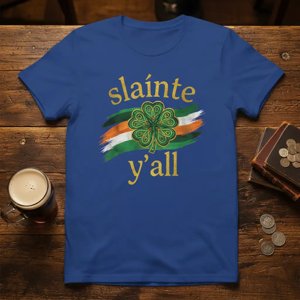 Pick from Black, Navy, Royal, Dark Heather, Red, and White to match your mood and wardrobe staples. Each colorway keeps the sláinte y’all design clear and photo-ready for everyday wear.