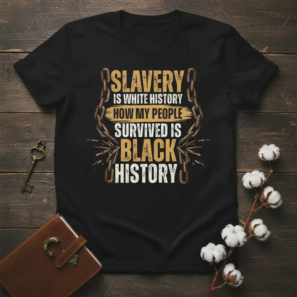 This powerful tee proudly declares, “Slavery Is White History, How My People Survived Is Black History,” honoring the resilience and legacy of Black people. Crafted for comfort and durability, it’s a meaningful way to express pride and acknowledge crucial historical truths. This shirt makes an impactful gift for anyone passionate about Black history and heritage.