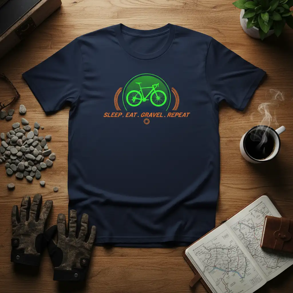 SLEEP. EAT. GRAVEL. REPEAT encapsulates the lifestyle of dedicated cyclists who live and breathe for the thrill of off-road adventures. This phrase perfectly captures the cyclical nature of their passion, from the initial preparation and the ride itself to the recovery and anticipation of the next journey. It’s more than just a motto; it’s a testament to the commitment and joy found in exploring challenging terrains. This t-shirt is designed to be a wearable badge of honor for anyone who understands the unique allure of gravel biking.
