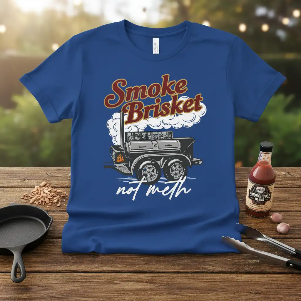 Pick from Black, Navy, Royal, Dark Heather, Red, and White to match your mood and wardrobe staples. Each colorway keeps the Smoke Brisket not meth design clear and photo-ready for everyday wear.