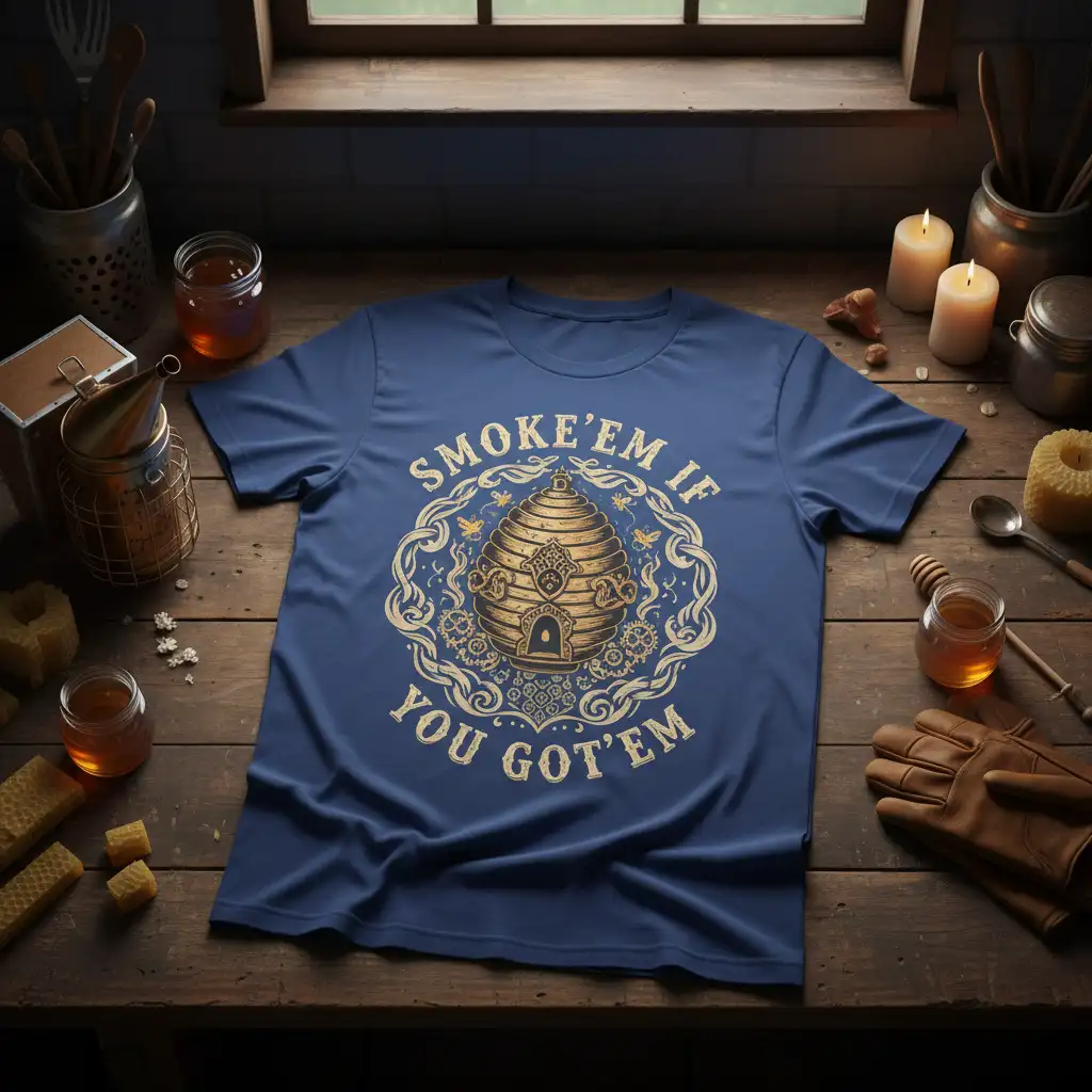 Smoke’Em If You Got’Em, this t-shirt is designed for the dedicated beekeeper, the honey enthusiast, or anyone who appreciates the fascinating world of bees. It’s more than just apparel; it’s a statement piece that celebrates a unique and rewarding hobby. The intricate design features a detailed beehive at its center, encircled by whimsical patterns and buzzing bees, all rendered in a striking gold on a rich navy blue fabric. This shirt is sure to become a favorite in your wardrobe, sparking conversations and connections with fellow bee lovers.