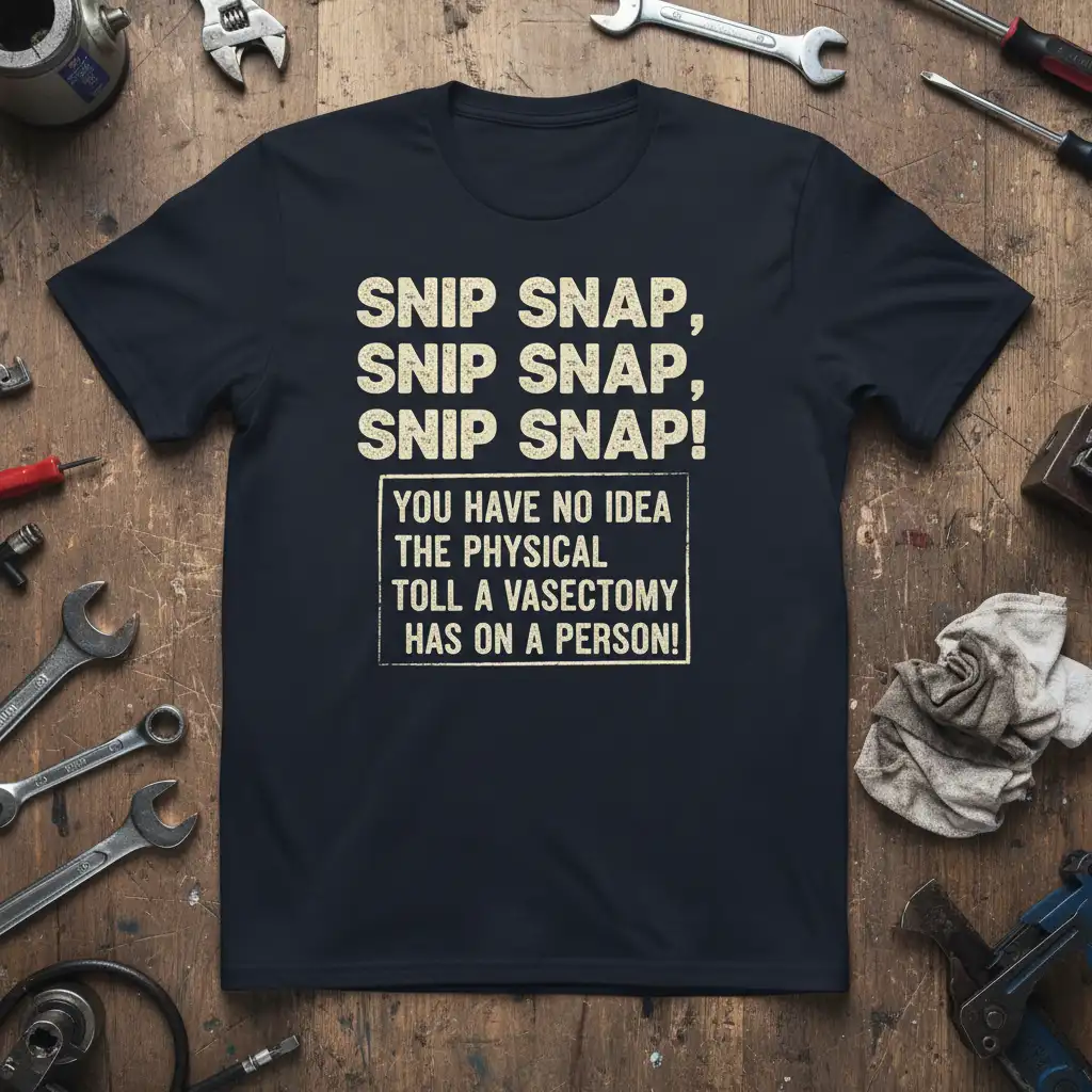 This t-shirt boldly proclaims “SNIP SNAP, SNIP SNAP, SNIP SNAP! YOU HAVE NO IDEA THE PHYSICAL TOLL A VASECTOMY HAS ON A PERSON!”. It’s crafted for those who aren’t afraid to joke about sensitive topics and for friends or partners looking for a unique and memorable gift. The design itself is a conversation starter, perfect for birthdays, bachelor parties, or just because.