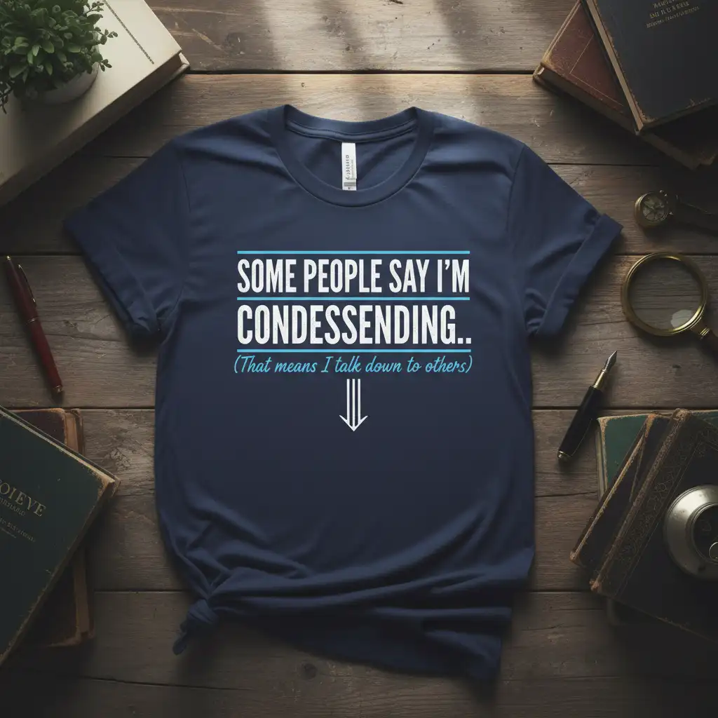 SOME PEOPLE SAY I’M CONDESSENDING.. (That means I talk down to others) is a phrase that perfectly captures the essence of witty self-awareness and playful sarcasm. This design isn’t just a statement; it’s a humorous clarification for those who appreciate a good laugh and a sharp mind. It’s for individuals who aren’t afraid to be a little cheeky and enjoy a shirt that sparks conversations and smiles. This t-shirt celebrates the art of clever communication with a touch of playful arrogance.