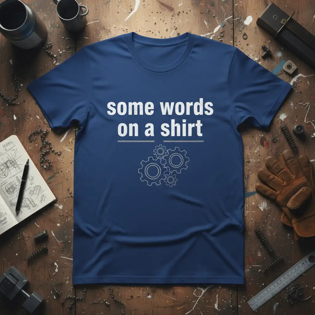 This t-shirt features a prominent white text that reads “some words on a shirt,” a meta-commentary on apparel design itself. This simple yet profound message is complemented by a graphic of three interlocking gears, symbolizing mechanics, engineering, and the interconnectedness of complex systems. The design is executed in a subtle grey, creating a sophisticated contrast with the bold white typography. It’s a piece that sparks conversation and showcases a unique sense of humor.