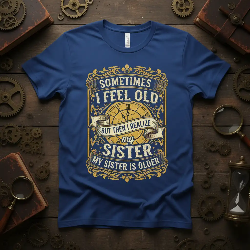 Sometimes I Feel Old But Then I Realize My Sister My Sister Is Older This humorous t-shirt perfectly captures the playful dynamic between siblings, especially when age starts to become a topic of discussion. It’s a witty remark that resonates with anyone who has an older sister and loves to tease them about it, or perhaps even acknowledges their own journey through time. The design itself is crafted with a vintage aesthetic, featuring a classic clock face and ornate borders that evoke a sense of timelessness and nostalgia.