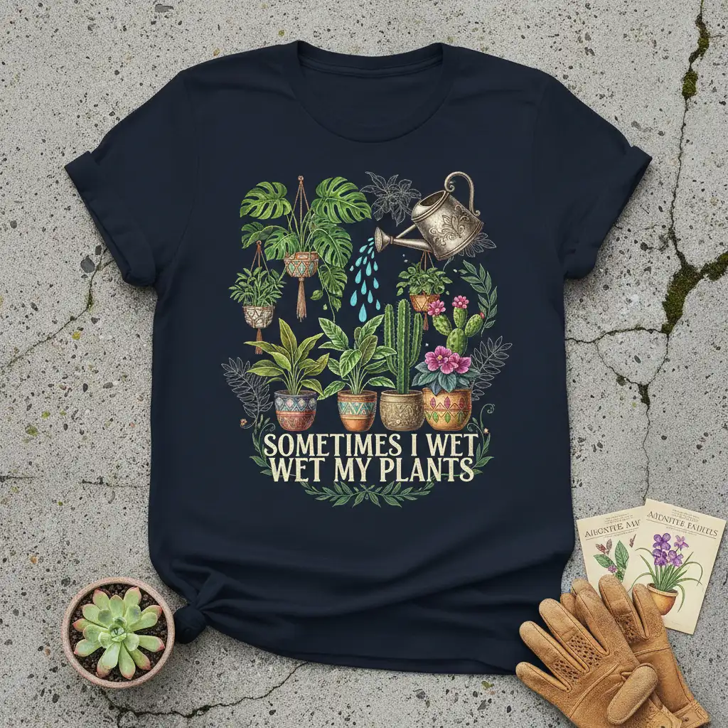 Wearing this shirt is a subtle yet effective way to signal your passion for gardening and houseplants. It’s a conversation starter that can connect you with other like-minded individuals who understand the satisfaction of seeing a new leaf unfurl or a bloom appear. This SOMETIMES I WET WET MY PLANTS design is printed on a soft, high-quality fabric, ensuring it feels as good as it looks, perfect for casual outings or relaxing at home surrounded by your plant collection.