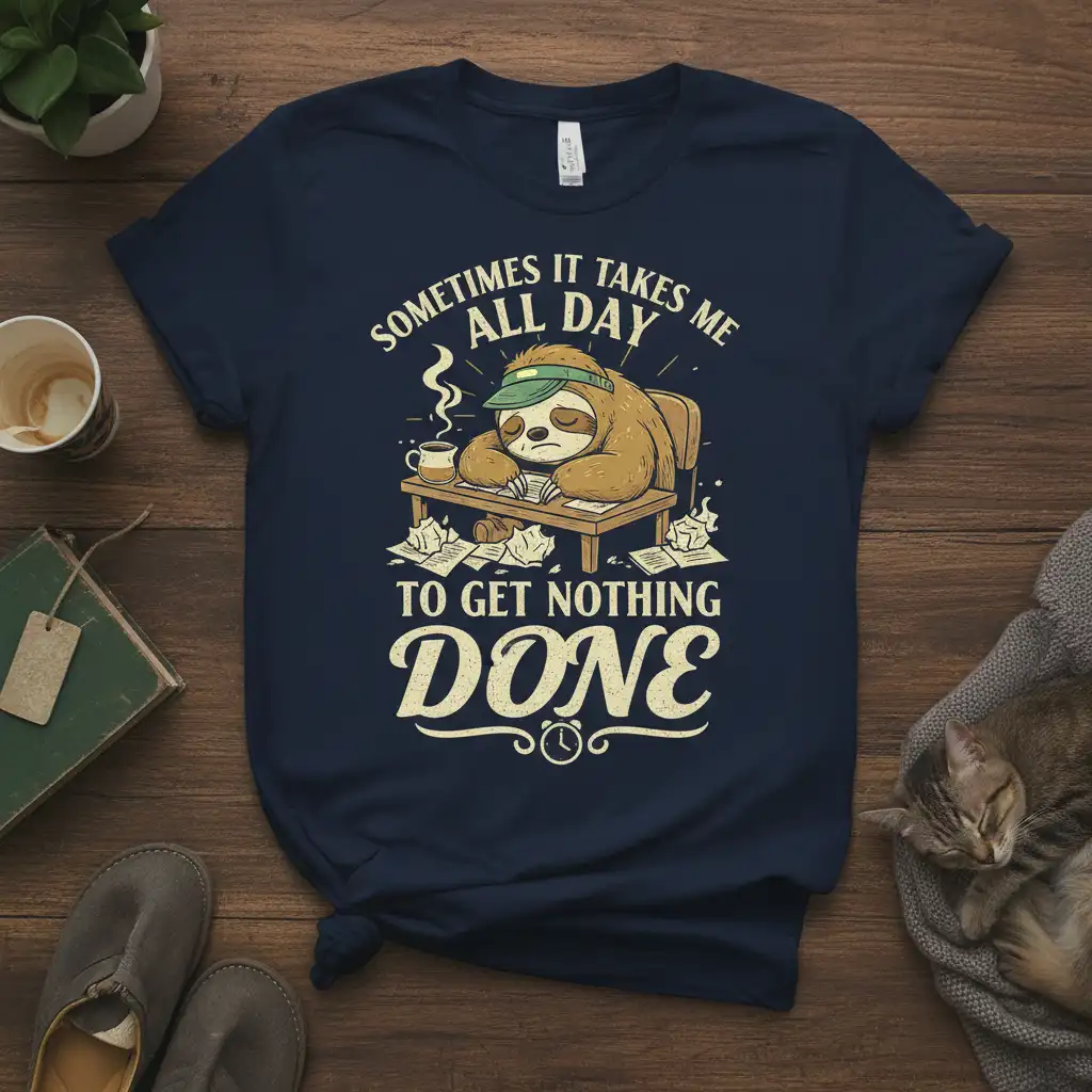 Sometimes It Takes Me All Day To Get Nothing Done, and this t-shirt is the perfect way to express that sentiment with a touch of humor. Featuring a charmingly exhausted sloth at a cluttered desk, this design speaks to anyone who has ever felt the struggle of productivity or simply enjoys the art of relaxation. It’s more than just apparel; it’s a wearable statement of relatable experiences and a gentle reminder to embrace the slower moments in life. This tee is designed for comfort and style, making it an ideal addition to any casual wardrobe for those who appreciate a good laugh.