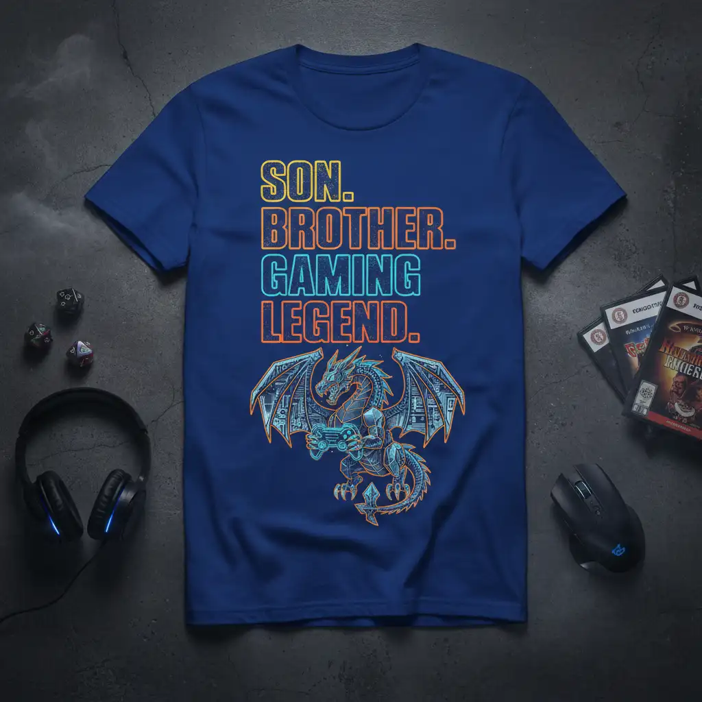 The vibrant text, “SON. BROTHER. GAMING LEGEND.”, is presented in distinct, eye-catching colors, making the message pop. This combination of a fierce dragon and empowering text creates a statement piece that any gamer would be proud to wear. It’s an ideal way to express pride in one’s gaming achievements and identity.