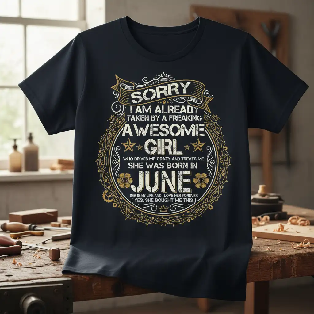 Sorry I Am Already Taken By A Freaking Awesome Girl Who Drives Me Crazy And Treats Me She Was Born In June She Is My Life And I Love Her Forever Yes She Bought Me This. This statement t-shirt is more than just apparel; it’s a declaration of love and appreciation for the amazing women born in June. The intricate design, featuring ornate borders, stars, and floral motifs, adds a touch of elegance to this heartfelt message. It’s designed to make her feel cherished and proud of her birth month. This piece is perfect for birthdays, anniversaries, or just to show her how much she means to you. Celebrate the unique spirit of a June-born girl with this one-of-a-kind tee.