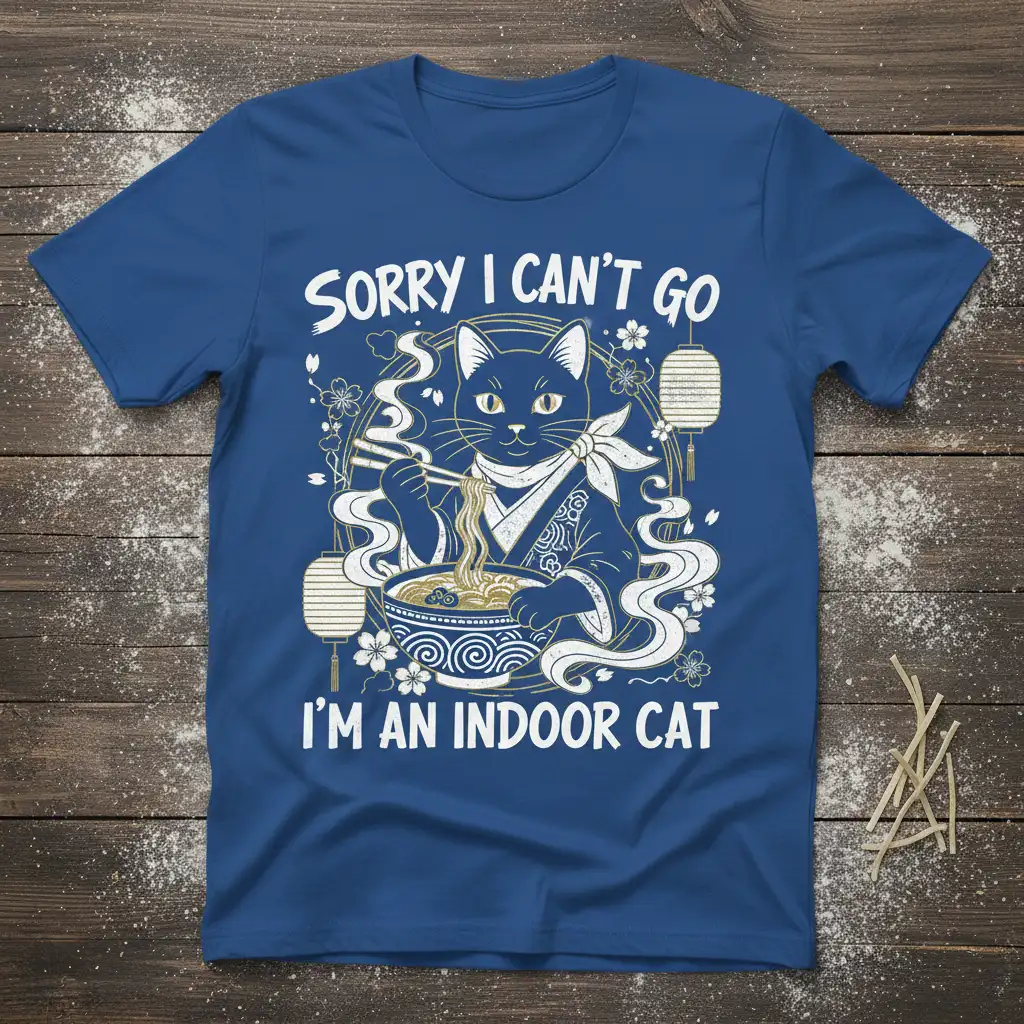 SORRY I CAN’T GO I’M AN INDOOR CAT is more than just a phrase; it’s a lifestyle statement for those who find their ultimate comfort and joy within the cozy confines of their home. This t-shirt celebrates the delightful personality of our feline companions and the equally content nature of their devoted human counterparts. It’s a perfect blend of humor, cultural appreciation, and a shared love for all things cozy and delicious, particularly ramen. Whether you’re a dedicated cat parent or simply someone who cherishes quiet evenings, this design speaks to your soul. It’s crafted for comfort and style, making it an ideal addition to any casual wardrobe.