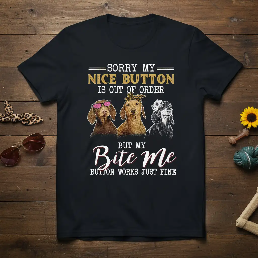 Sorry My Nice Button Is Out Of Order But My Bite Me Button Works Just Fine This t-shirt is the ultimate statement piece for anyone who isn’t afraid to show a little attitude. It perfectly captures that feeling when you’ve had enough and your directness takes over, all with a touch of humor and undeniable canine charm. The design features three adorable dachshunds, each with their own distinct personality, adding a visual flair to the witty phrase. It’s more than just apparel; it’s a conversation starter and a declaration of your fun-loving, no-nonsense spirit.