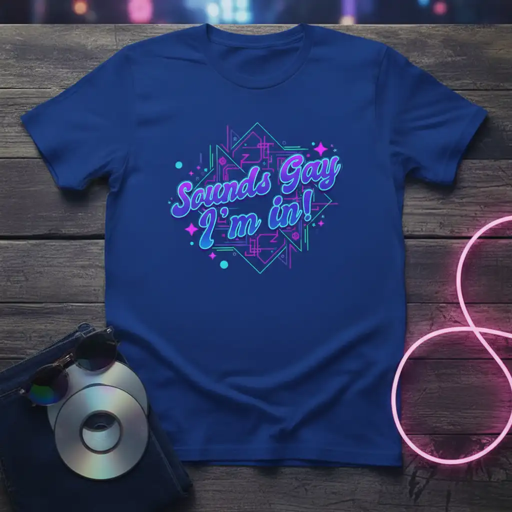 This eye-catching t-shirt proudly displays the empowering slogan “Sounds Gay I’m in!” in a captivating neon-inspired font. The design is enhanced with dynamic geometric shapes and playful sparkling accents, creating a visually arresting graphic that commands attention. It’s crafted for comfort and durability, ensuring that you can wear your pride with confidence and style for any occasion.