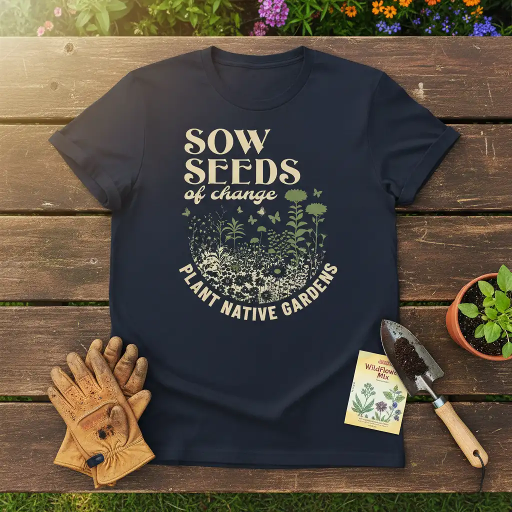 The “Sow Seeds of Change” message on this shirt highlights the simple yet powerful act of planting. It suggests that every seed sown, every garden cultivated, contributes to a larger movement of positive environmental transformation. It’s an invitation to participate in creating change, one native plant at a time.