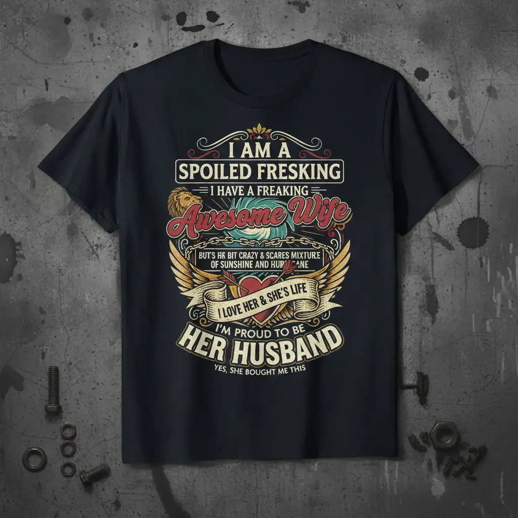 I AM A SPOILED FRESKING I HAVE A FREAKING Awesome Wife BUT’S HR BIT CRAZY & SCARES MIXTURE OF SUNSHINE AND HURRICANE I LOVE HER & SHE’S LIFE I’M PROUD TO BE HER HUSBAND YES, SHE BOUGHT ME THIS T-Shirt celebrates the special bond between husbands and their amazing wives. This shirt is designed for those who know they are utterly spoiled by their fantastic partners. It humorously acknowledges the vibrant, sometimes chaotic, but always loving nature of their relationship, highlighting the wife’s incredible impact. It’s a perfect way for a husband to express his love and appreciation while sharing a laugh.