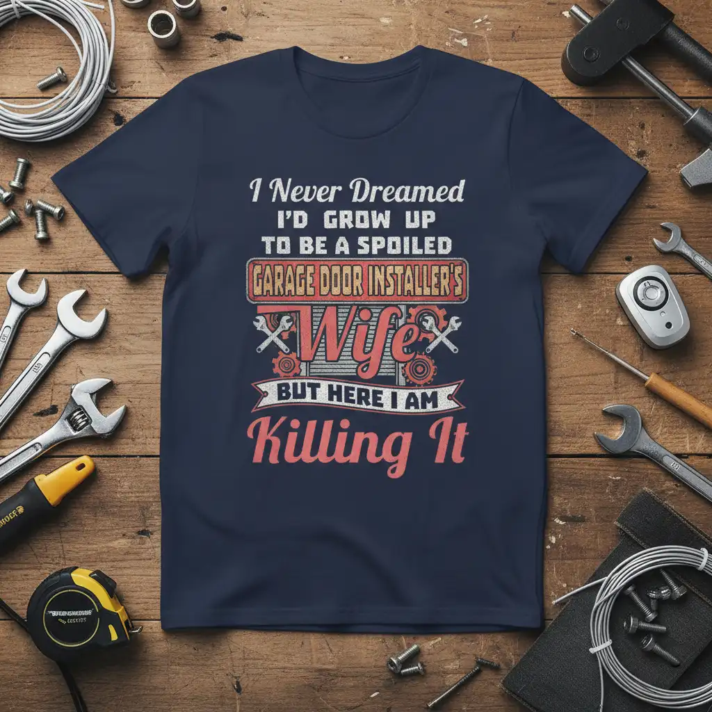 I Never Dreamed I’d Grow Up To Be A Spoiled Garage Door Installer’s Wife But Here I Am Killing It. This statement t-shirt is designed for the incredible women who stand by their garage door installer partners, proving that being a supportive spouse doesn’t mean you can’t be powerful and successful in your own right. It’s a celebration of strength, resilience, and the unique journey of being married to someone in a skilled trade. This shirt is more than just apparel; it’s a declaration of independence and a nod to the multifaceted lives of these amazing women.
