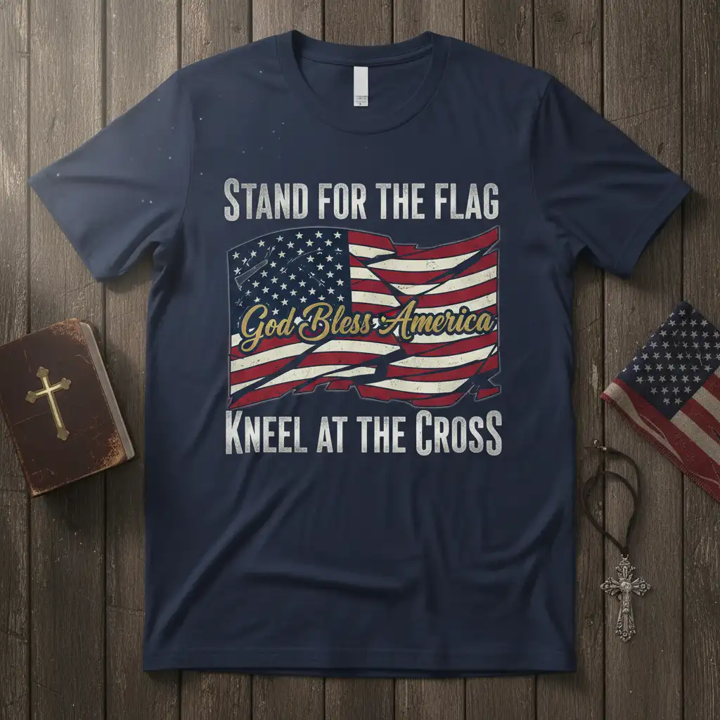 STAND FOR THE FLAG God Bless America KNEEL AT THE CROSS is more than just a slogan; it’s a declaration of deeply held beliefs and a symbol of national pride intertwined with spiritual devotion. This impactful design resonates with individuals who cherish both their country and their faith, offering a way to express these core values outwardly. It serves as a constant reminder of the principles that form the bedrock of a free society and a faithful life. This shirt is crafted for those who aren’t afraid to stand up for what they believe in, blending civic duty with spiritual conviction.