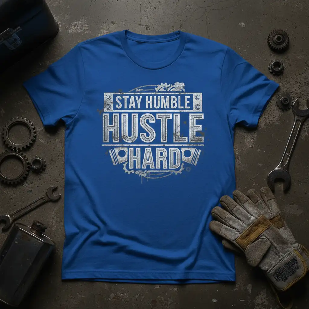 This motivational t-shirt is designed to inspire and endure, much like the hustle it represents. The prominent “Stay Humble Hustle Hard” text is rendered in a bold, distressed style, conveying a sense of hard-won experience and authentic grit. Surrounding the quote are industrial graphic elements, including gears and pistons, which visually communicate the mechanical precision and relentless power required to achieve great things. This design isn’t just about motivation; it’s about embodying a mindset of continuous effort and grounded ambition.