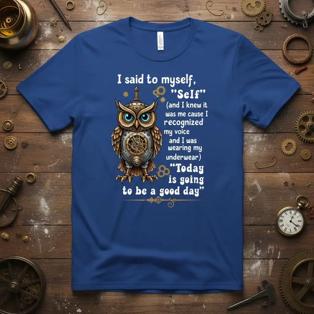 I said to myself, “Self” (and I knew it was me cause I recognized my voice and I was wearing my underwear) “Today is going to be a good day”, this incredible t-shirt captures a moment of profound self-awareness and optimistic declaration. The design features a captivating steampunk owl, symbolizing wisdom and intricate mechanical beauty, paired with an inspiring quote that resonates with anyone who has experienced a similar realization. It’s more than just apparel; it’s a wearable reminder of self-discovery and the power of positive thinking to shape your day.